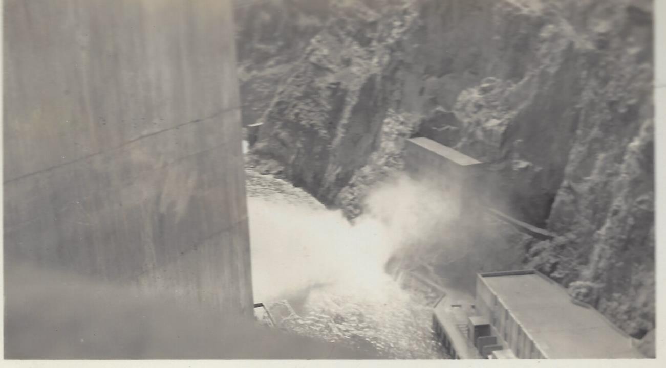 J. V. Averitt and Charles Covington at Hoover DamLake MeadHoover Dam Spillway from electric turbinesLowering Loaded Flat Car at Hoover Dam