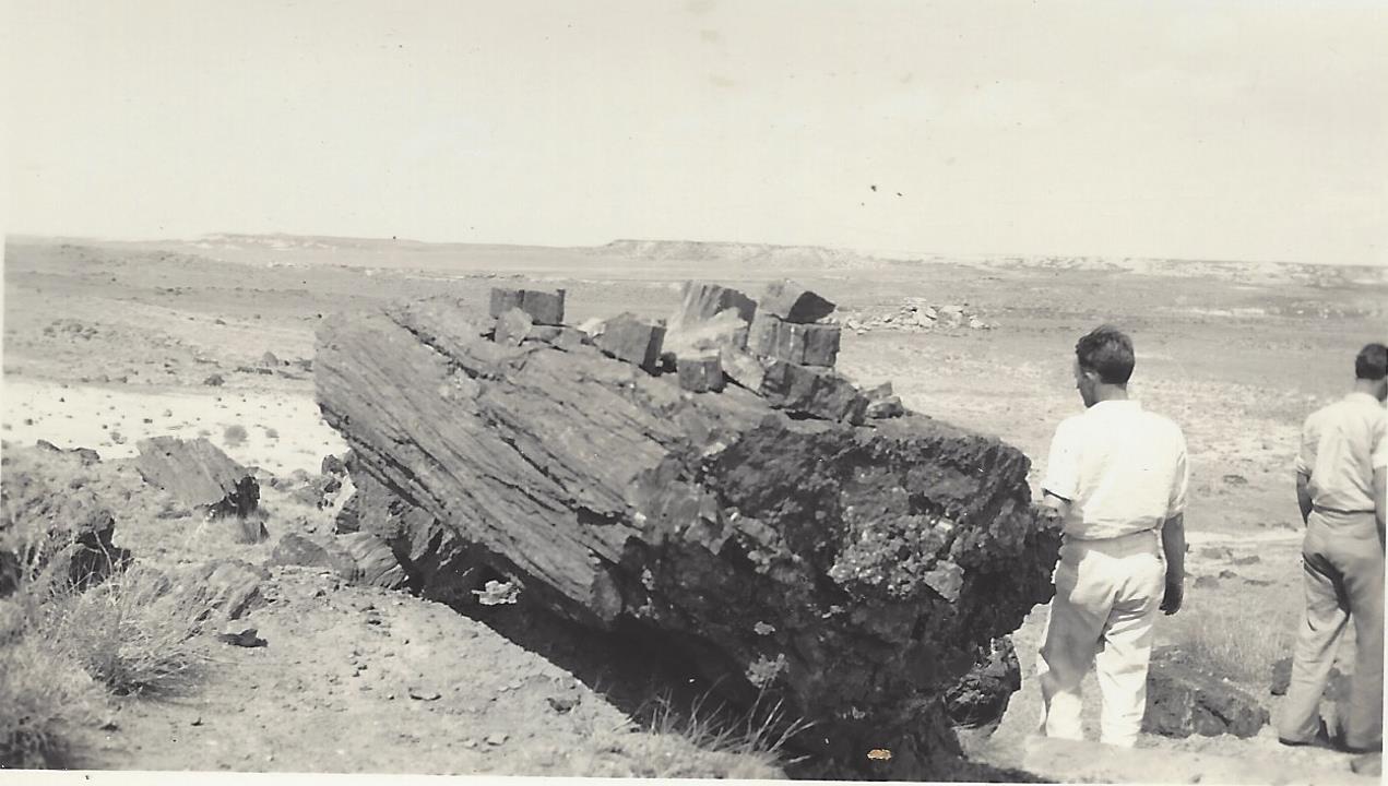 The next pictures find our young men in the Petrified Forest in Arizona. At that point they would have been along Route # 66. J. V. Averitt told his son, Phil, about how many times they had to patch the tires on the old car. Back then, tires had inner-tubes, that held the air, inside the outer tire. If the tube got a hole in it, they would take the inner-tube out, patch it, then put it back inside the outer tire before re-inflating it.