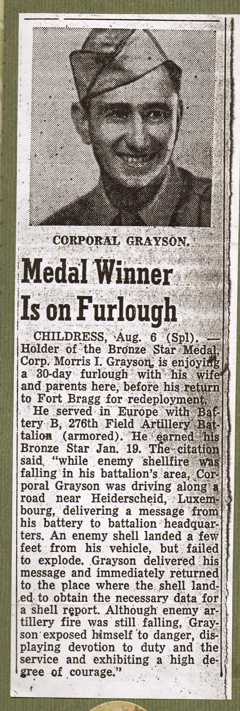 Thanks to Teresa Williams for allowing me to use her father’s photos. Her father is Morris I. Grayson, Battery “B”, 276th Armored Field Artillery Battalion. Details were taken from the history of the 276th Armored Field Artillery Battalion compiled by Sgt. Bruce B. Palmer.