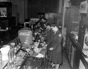 The Red Cross Canteen Corps set up on docks, in railroad stations, in airports, and on military posts to provide meals and snacks to military personnel while traveling or upon arrival at military bases. They also provided food to civilians at blood donor centers, child care centers and schools.